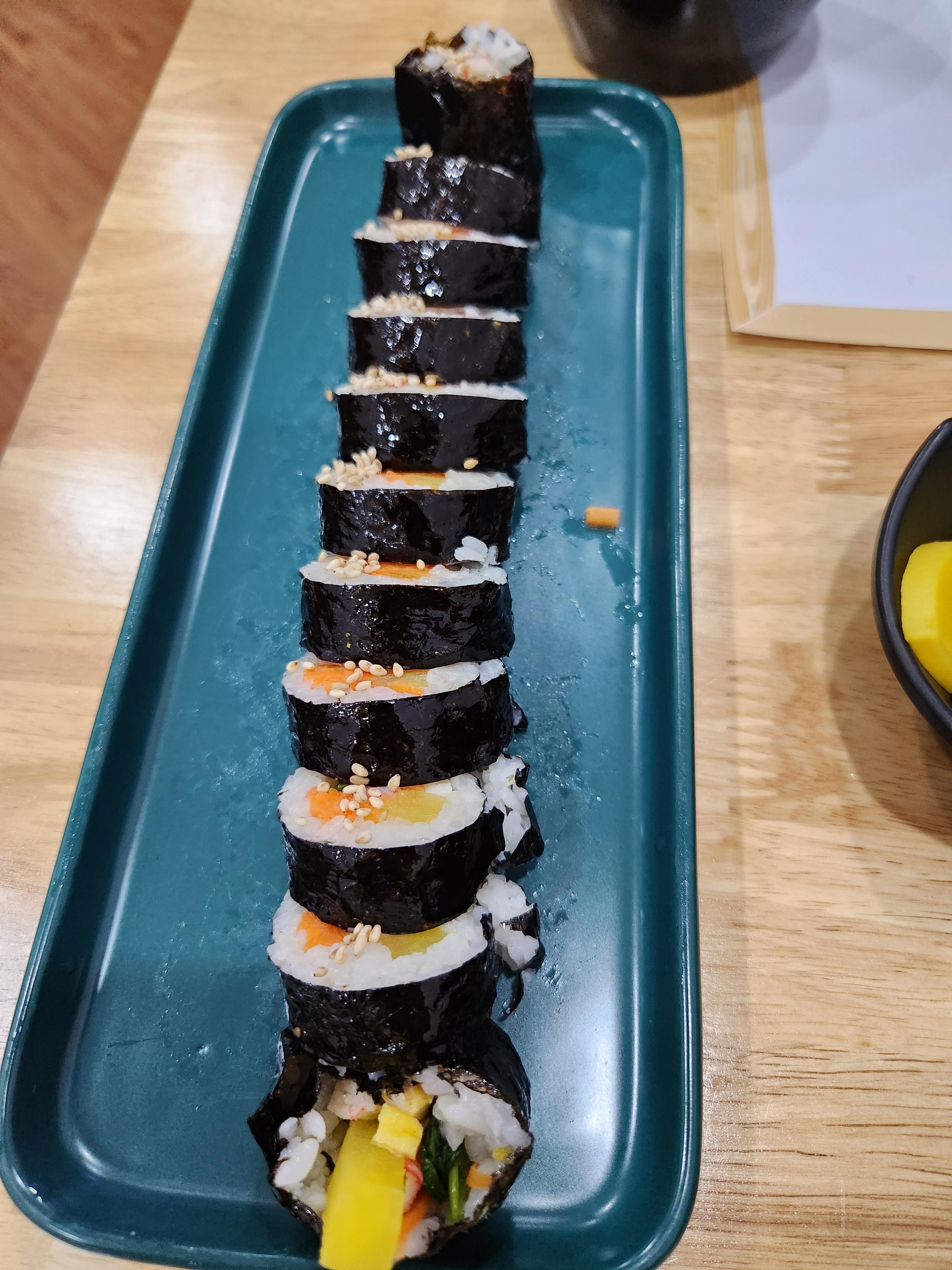 김밥은 많이 아쉬웠습니다. 재료가 빠진 것 없이 다 들어는 가있는데 두께도 얇고, 싱거웠습니다. 밥에 소금간이 안된 느낌 같았습니다.