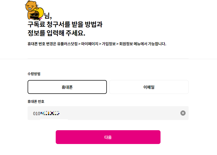 구독료 청구서를 받을 방법(휴대폰 or 이메일)을 선택하고