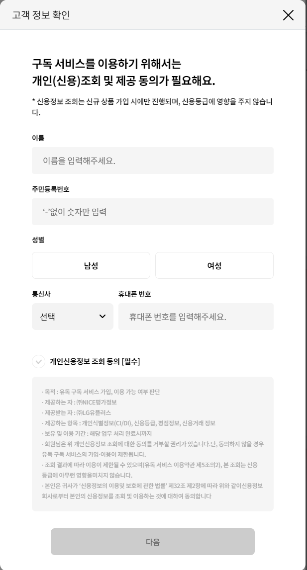 이름, 주민등록번호, 성별, 통신사 정보들을 기입합니다.